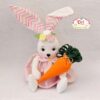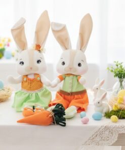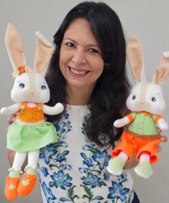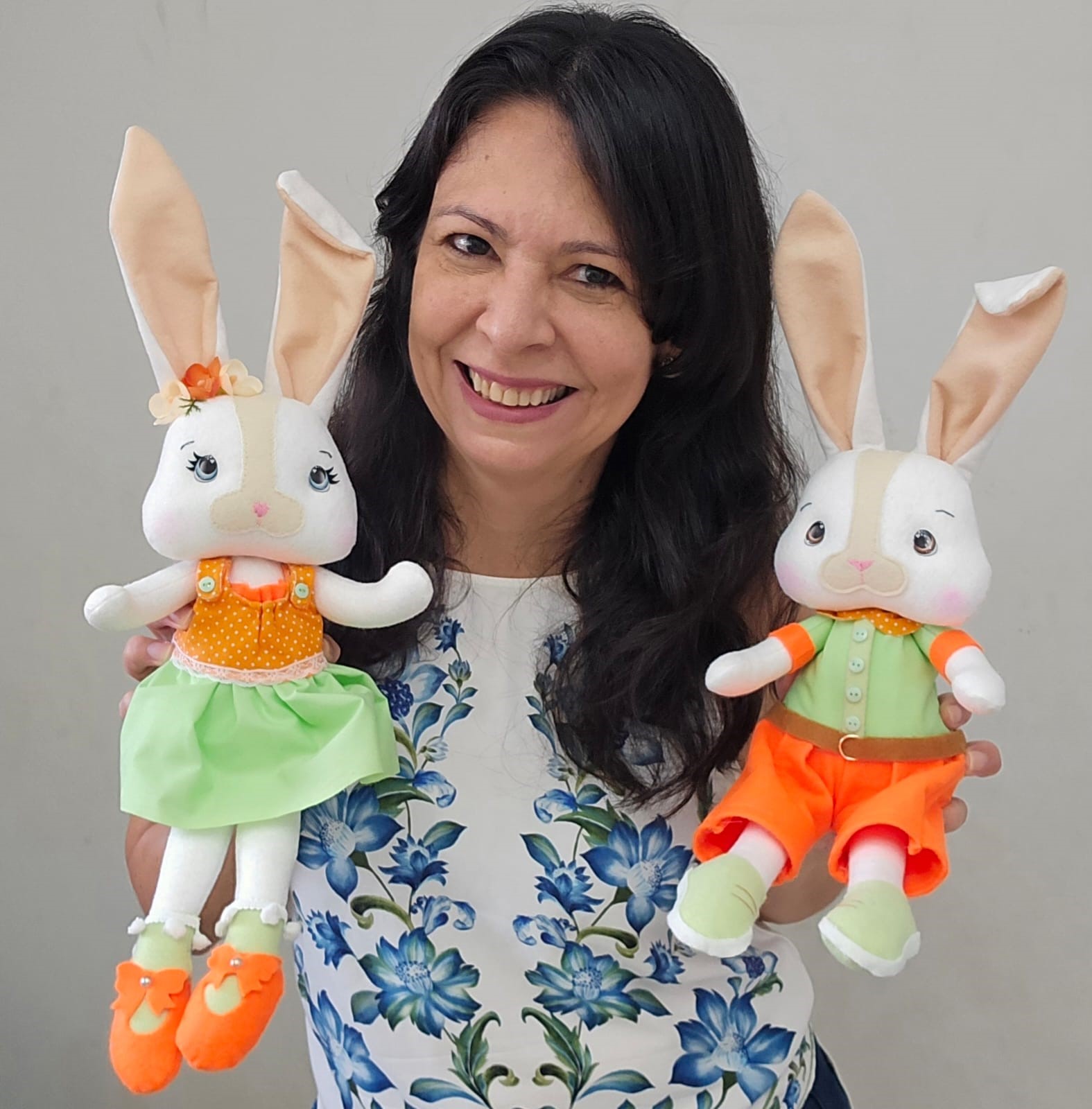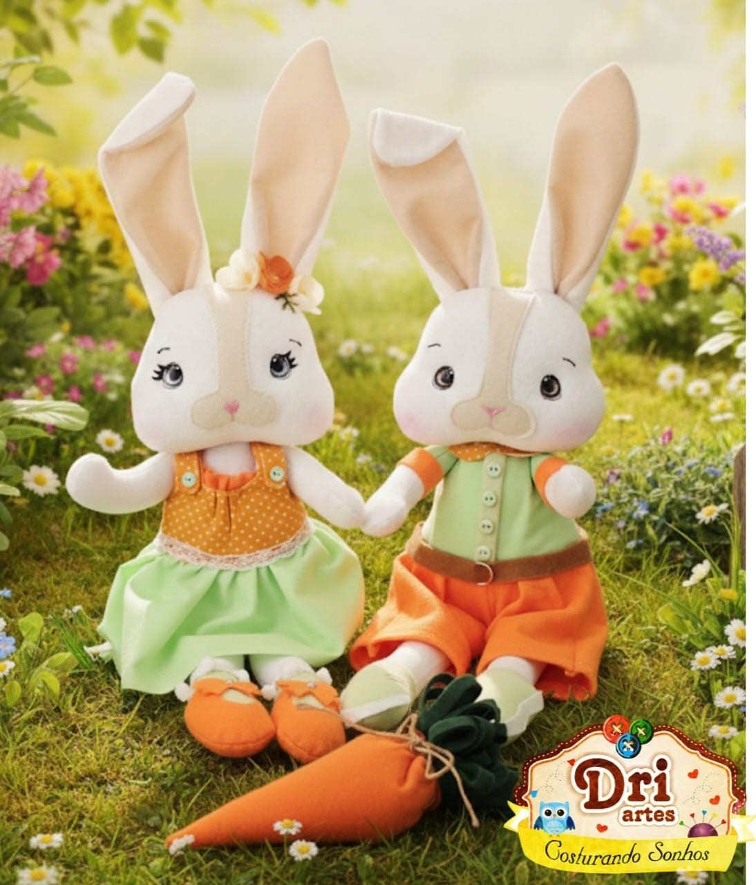 Casal de Coelho em feltro, com aproximadamente 33cm de altura, cada um. Eles ficam sentados; enchimento em fibra siliconada anti-alérgica.