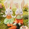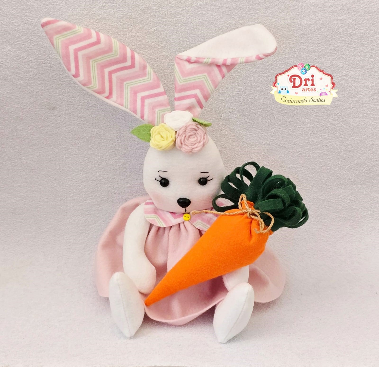 Coelha em feltro, com aproximadamente 25cm de altura, estando sentada; enchimento em fibra siliconada anti-alérgica.