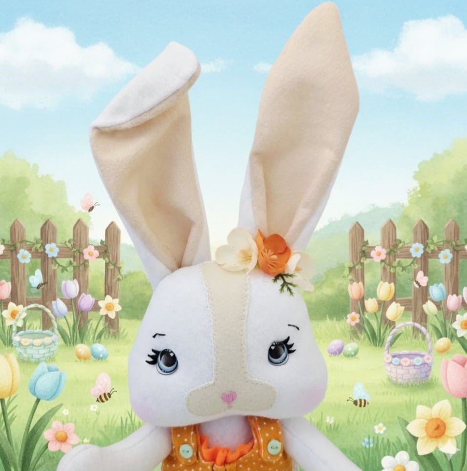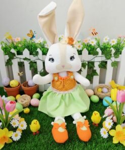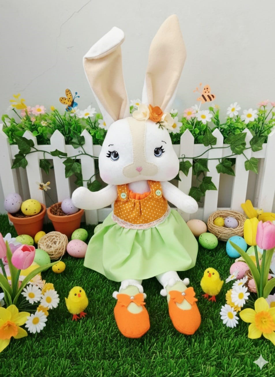 Coelha em feltro, com aproximadamente 33cm de altura, estando sentada; enchimento em fibra siliconada anti-alérgica.