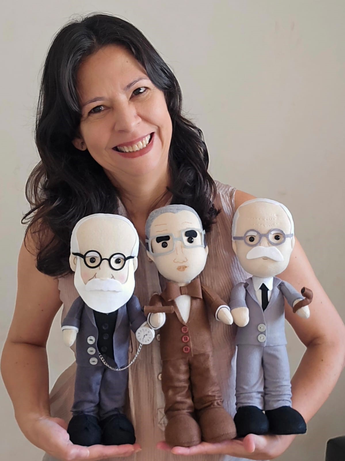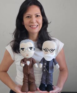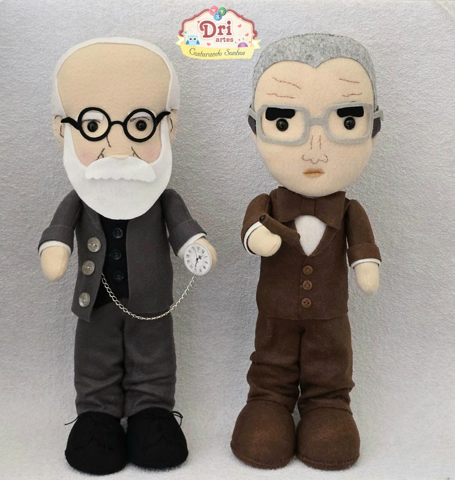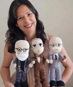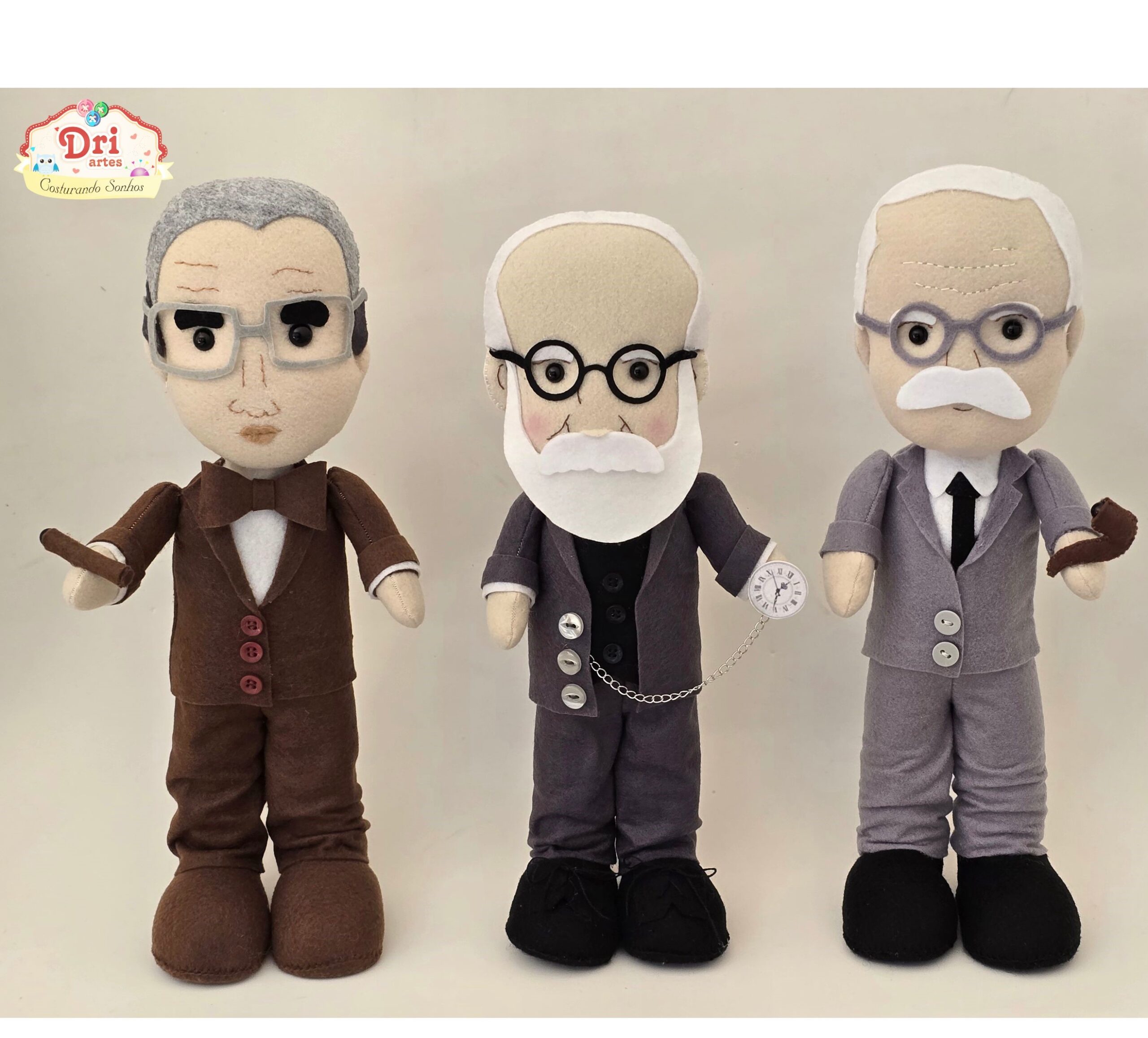 Bonecos Freud, Lacan e Jung em feltro, com aproximadamente 32cm de altura; enchimento em fibra siliconada anti-alérgica; fica em pé sozinho.