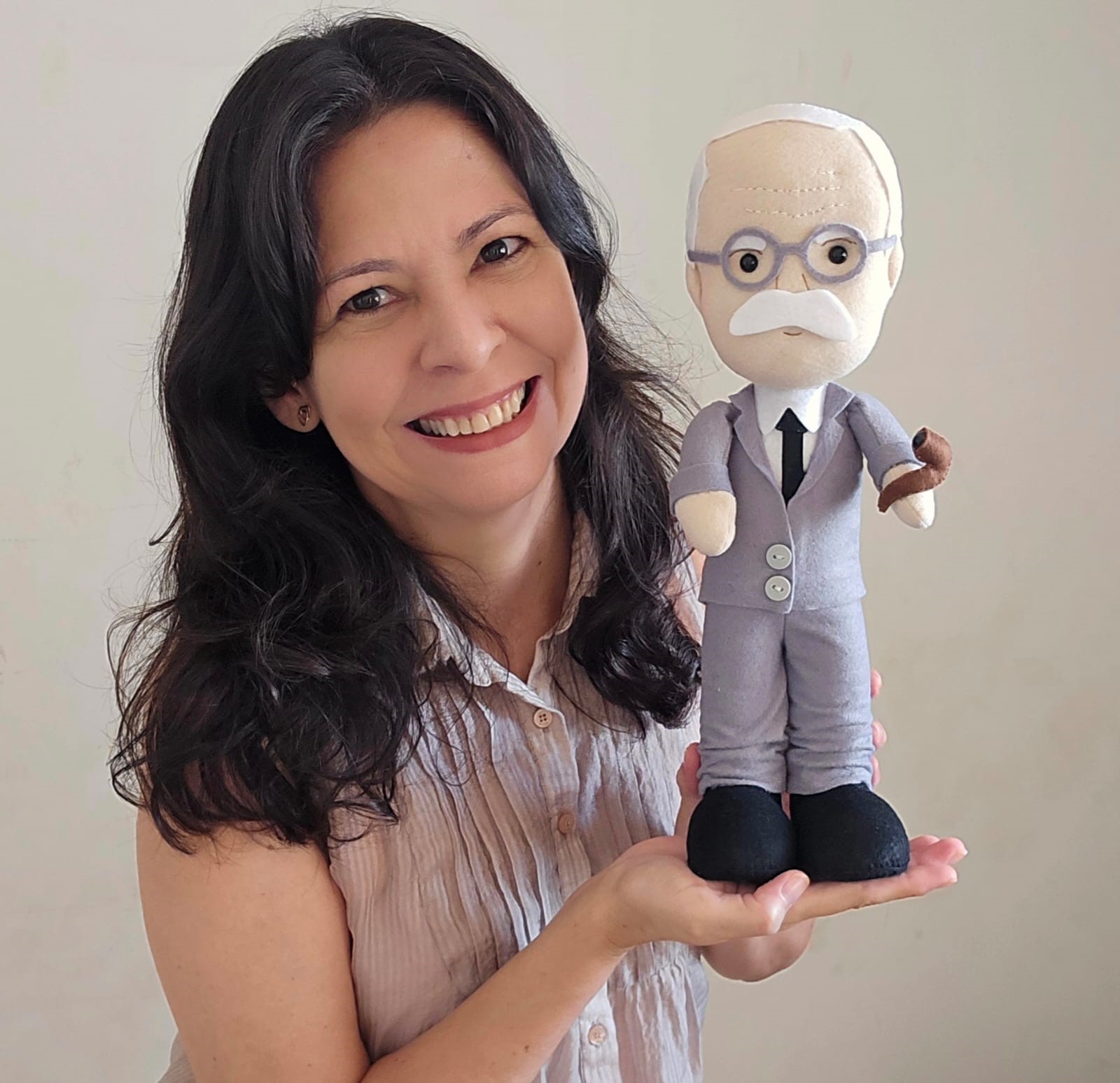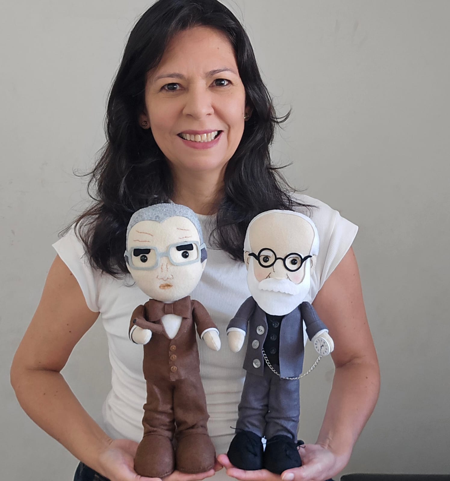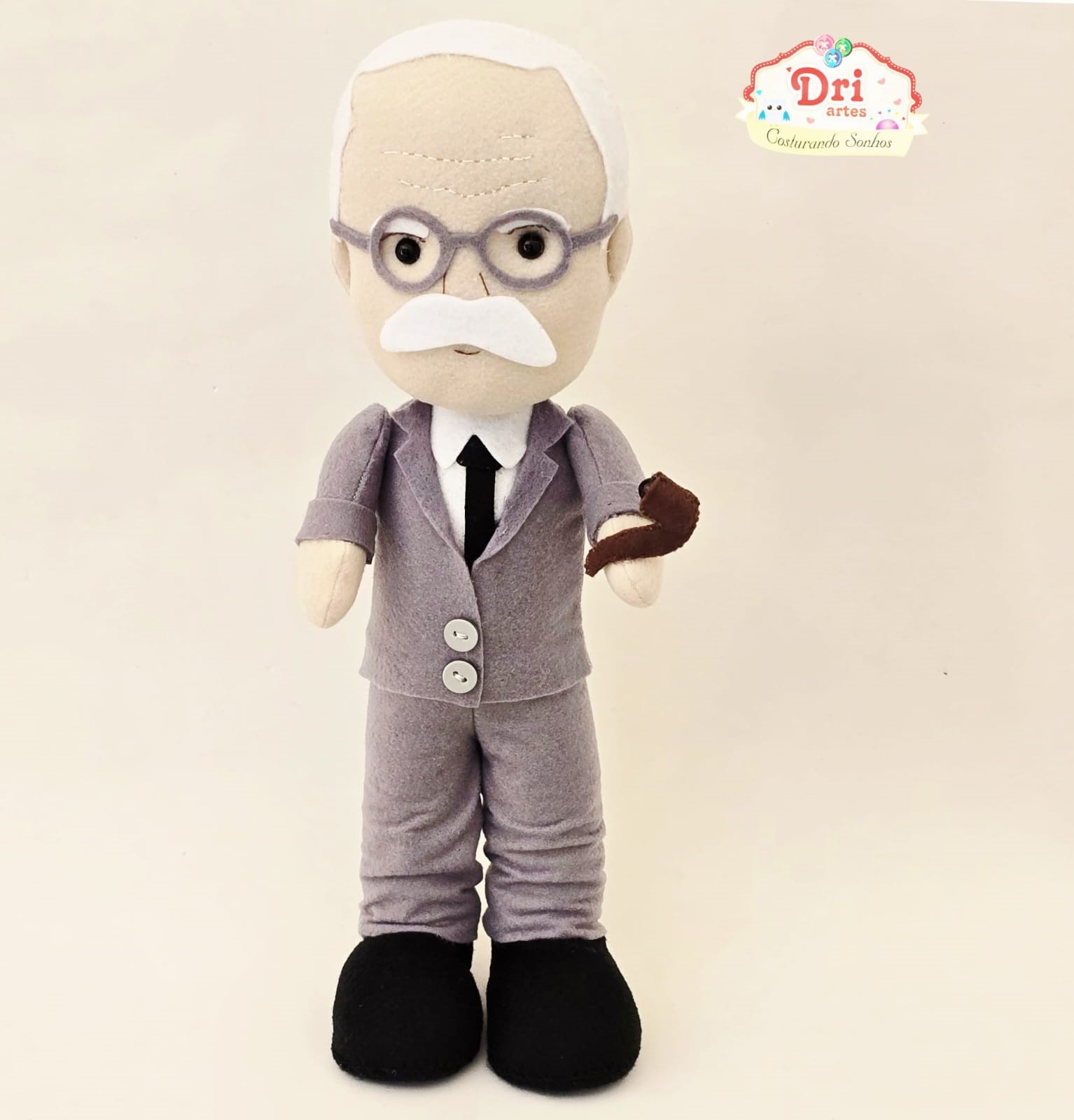 Bonecos Freud, Lacan e Jung em feltro, com aproximadamente 32cm de altura; enchimento em fibra siliconada anti-alérgica; fica em pé sozinho.